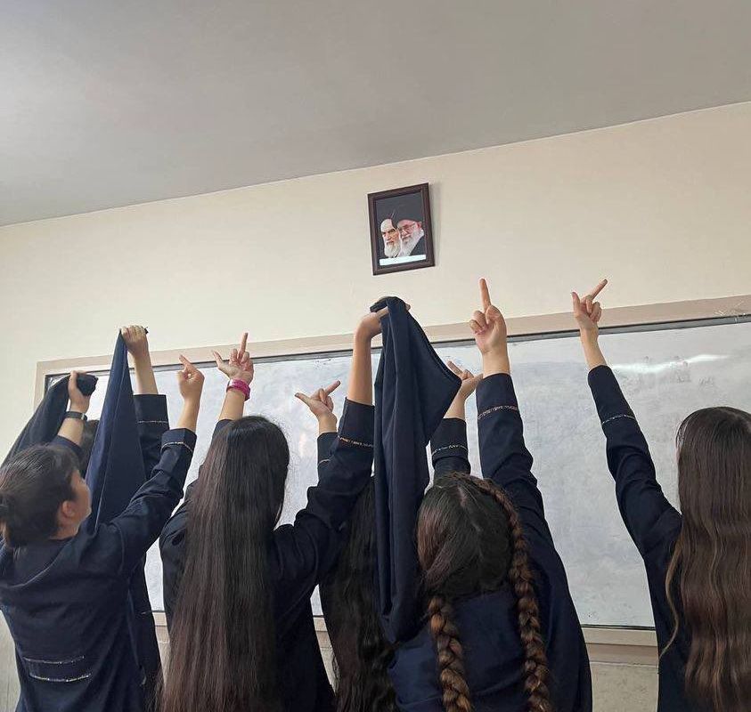 În Iran, revolta câștigă teren. După elevi, este rândul liceenilor să contraatace și să provoace autoritățile. Ilustrație cu un instantaneu care circulă pe rețelele de socializare de câteva zile. Vedem fete tinere, cu părul descoperit, arătând degetul mijlociu în direcția lui Ali Khamenei (actualul lider din Iran) și a lui Rouhollah Khomeini (liderul Revoluției din 1979, care l-a răsturnat pe șahul Iranului).