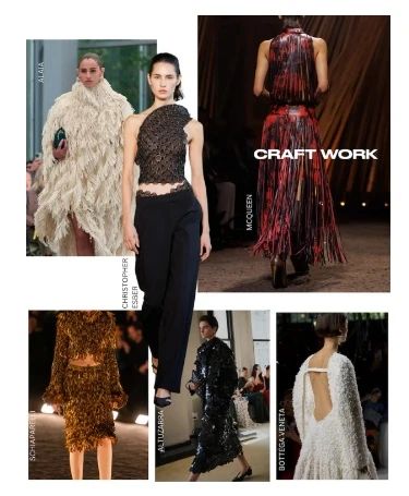 Suprafața devine o conversație pentru primăvara/vara 2026. O austeritate estetică a ciucurilor, ornamentelor, pene, aplicațiilor florale și franjurilor, ondulate și agitate pe multiple podiumuri, așa cum s-a văzut la Bottega Veneta, Chanel, McQueen, ca să numim doar câteva, o mișcare care invită la mișcare și o dorință de a atinge, chiar și într-o eră aglomerată a ecranelor.