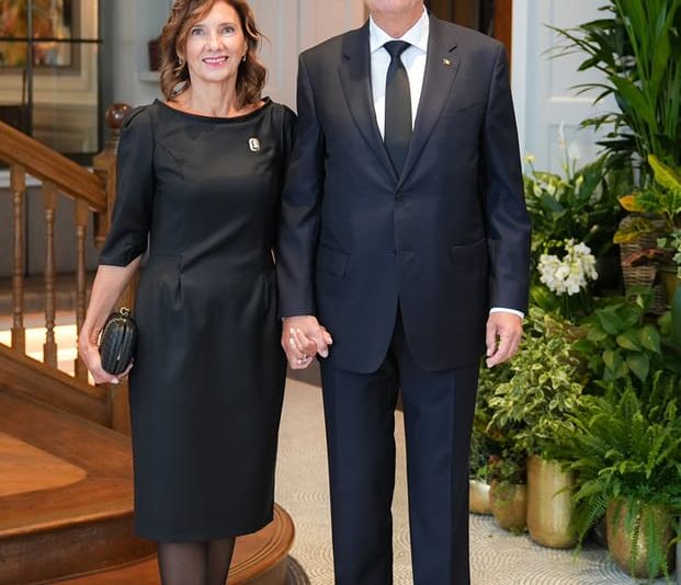 Carmen Iohannis a purtat o rochie semnată de designerul Andreea Tincu, cu care colaborează de ceva vreme. De altfel, creatoarea de modă a publicat pe Facebook o fotografie de la dineul cu Regele Charles al III-lea, în care soția președintelui Iohannis apare în ținută de doliu, dar zâmbitoare, de mână cu soțul ei.