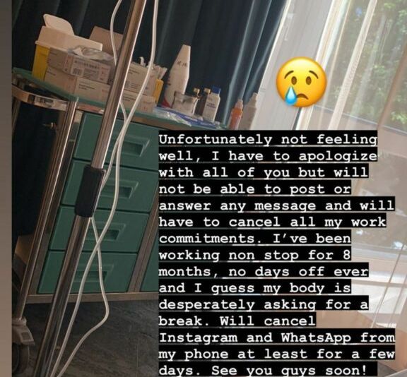 „Din păcate nu mă simt foarte bine. Îmi cer scuze tuturor, dar nu voi putea să postez sau să răspund la mesaje și va trebui să îmi anulez toate angajamentele de muncă. Am lucrat non-stop timp de 8 luni, fără nicio zi liberă și cred că corpul meu strigă disperat după o pauză. Voi renunța la Instagram și Whatsapp măcar pentru câteva zile. Ne vedem curând!”,
