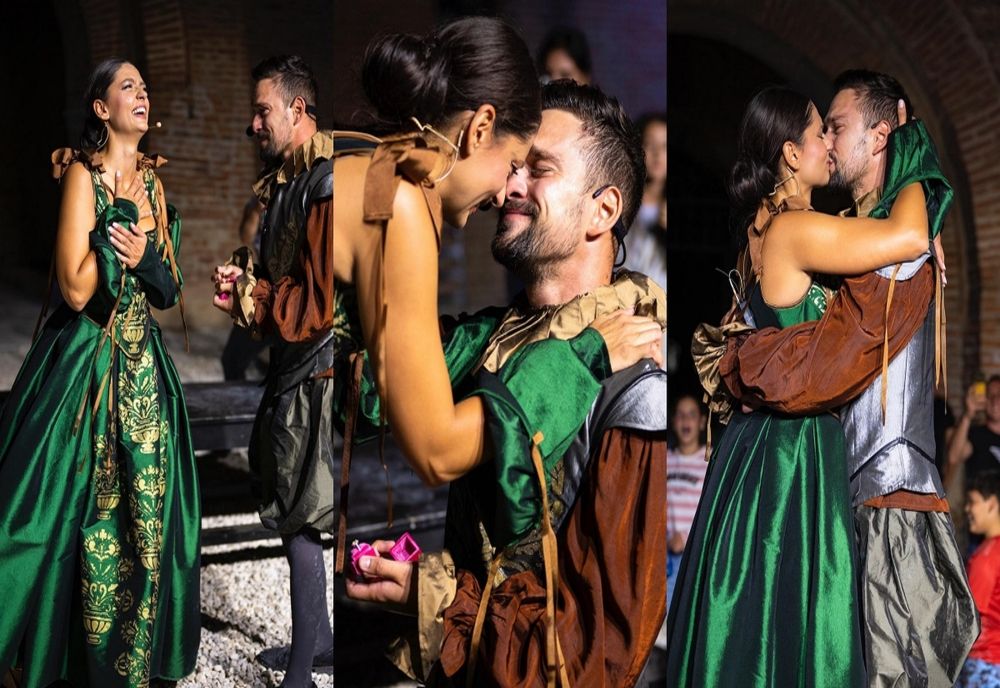Scena romantică s-a petrecut vineri, 11 august 2023, la finalul unui spectacol de teatru, premiera „Îmblânzirea scorpiei”, care a avut loc la Palatul Mogoșoaia, unde Vlad Gherman și Oana Moșneagu au jucat rolurile principale.