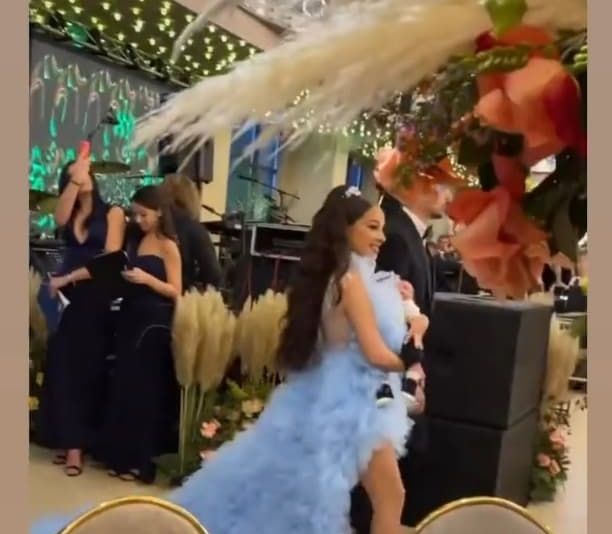 La petrecerea de botez însă, pe ringul de dans, artista s-a schimbat în două ținute ceva mai spectaculoase, o rochie de culoare albastră cu aplicații ce imită penele și trenă lungă și alta cu aplicații pe piept și mâneci cu pene.